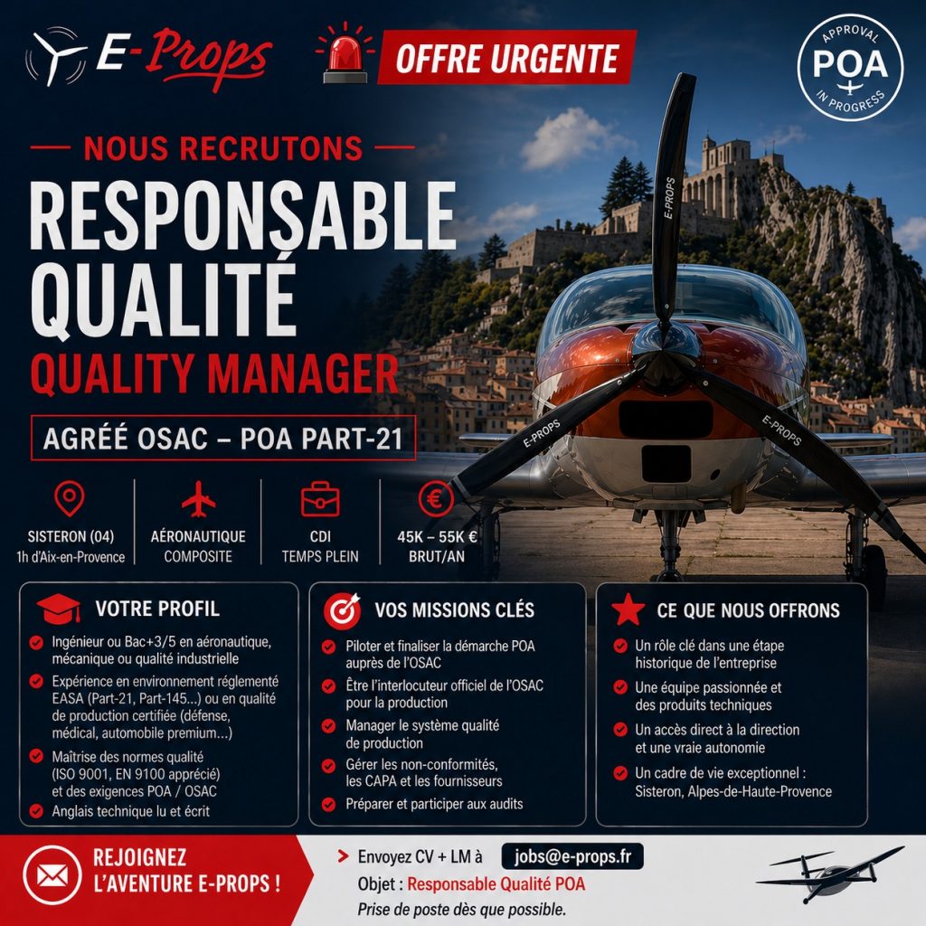 Dans le cadre de notre développement, E-PROPS recherche un(e) Responsable Qualité agréé OSAC (POA Part-21) pour piloter et structurer notre système qualité en production aéronautique.